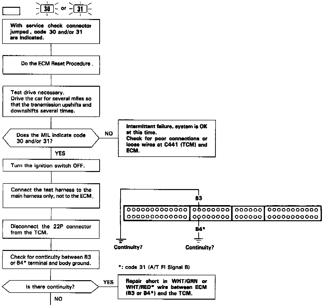 The Malfunction Indicator Lamp indicates Diagnostic Trouble Code 30: A problem in the A/T FI signal A circuit between transmission control module and engine control module.