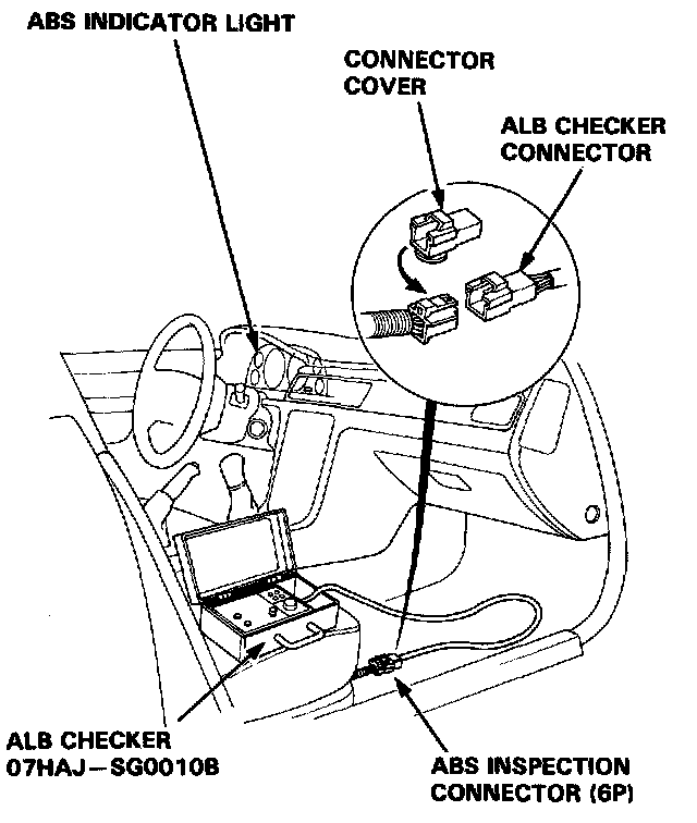 1. Disconnect the ABS inspection connector (6P) from the connector cover located on the cross- member under the passenger's seat and connect the ABS inspection connector (6P) to the ALB checker.
