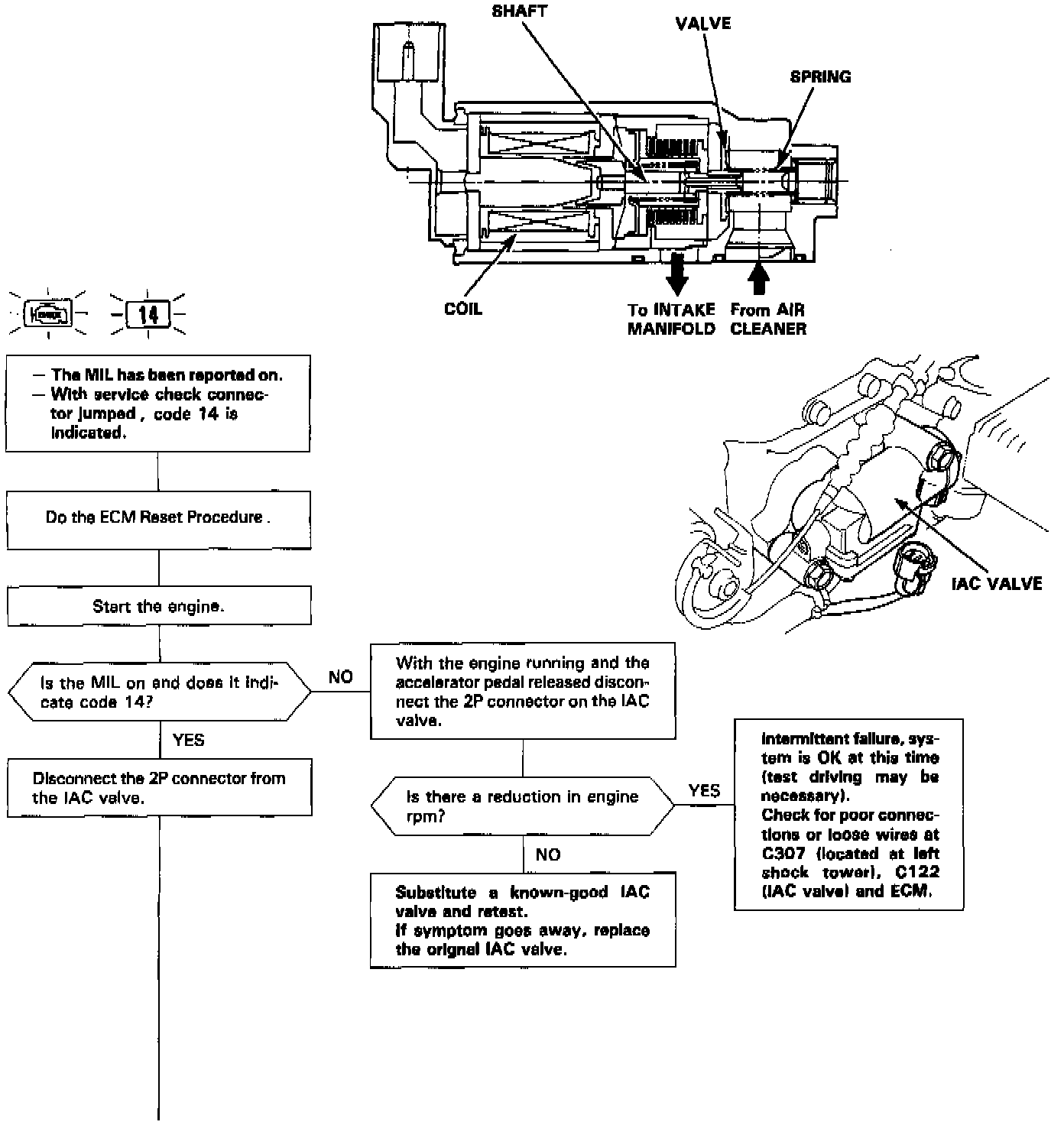 1. The Malfunction Indicator Lamp indicates Diagnostic Trouble Code 14: A problem in the Idle Air Control Valve circuit. Perform diagnostics following the flow chart.