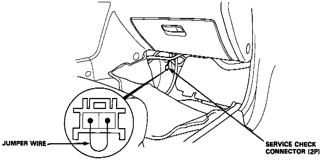 1. Connect the service check connector terminals with a jumper wire as shown (the service check connector (2P) is located under the dash on the passenger side of the car). Turn the ignition switch on.