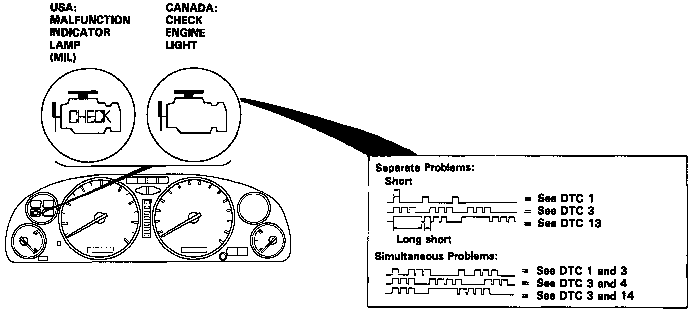 2. Note the Diagnostic Trouble Code: The malfunction indicator lamp indicates a code by the length and number of blinks. The malfunction indicator lamp can indicate simultaneous component problems by blinking separate codes, one after another. Codes 1 through 9 are indicated by individual short blinks. Codes 10 through 53 are indicated by a series of long and short blinks. The number of long blinks equals the first digit, the number of short blinks equals the second digit.