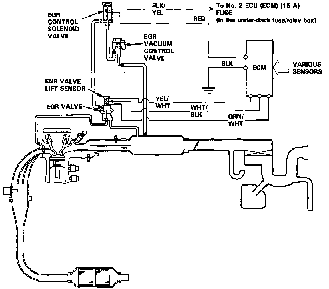 The exhaust gas recirculation system is designed to reduce oxides of nitrogen emissions (NOx) by recirculating exhaust gas through the exhaust gas recirculation valve and the intake manifold into the combustion chambers. It is composed of the exhaust gas recirculation valve, exhaust gas recirculation vacuum control valve, exhaust gas recirculation control solenoid valve, ECM and various sensors.