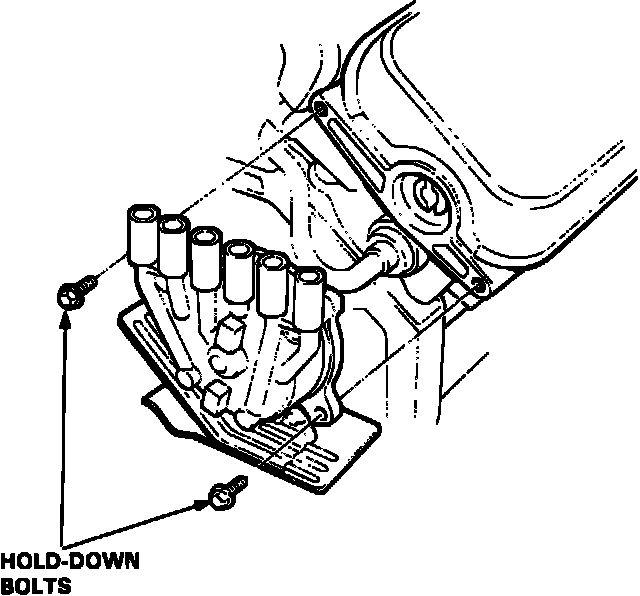 2. Remove the distributor hold-down bolts, then remove the distributor from the cylinder head.
