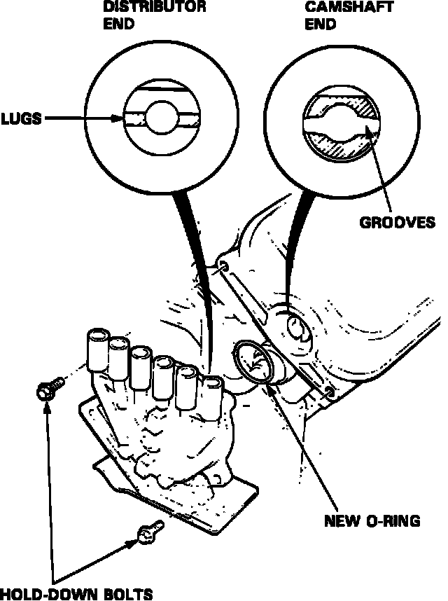 NOTE: The lugs on the end of the distributor and its mating grooves in the camshaft end are both offset to eliminate the possibility of installing the distributor 180° out of time.