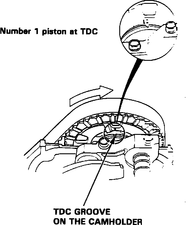 2. Align No. 1 piston to TDC with TDC groove on No. 1 cam holder, Fig. 57, then adjust No. 1 cylinder valves.