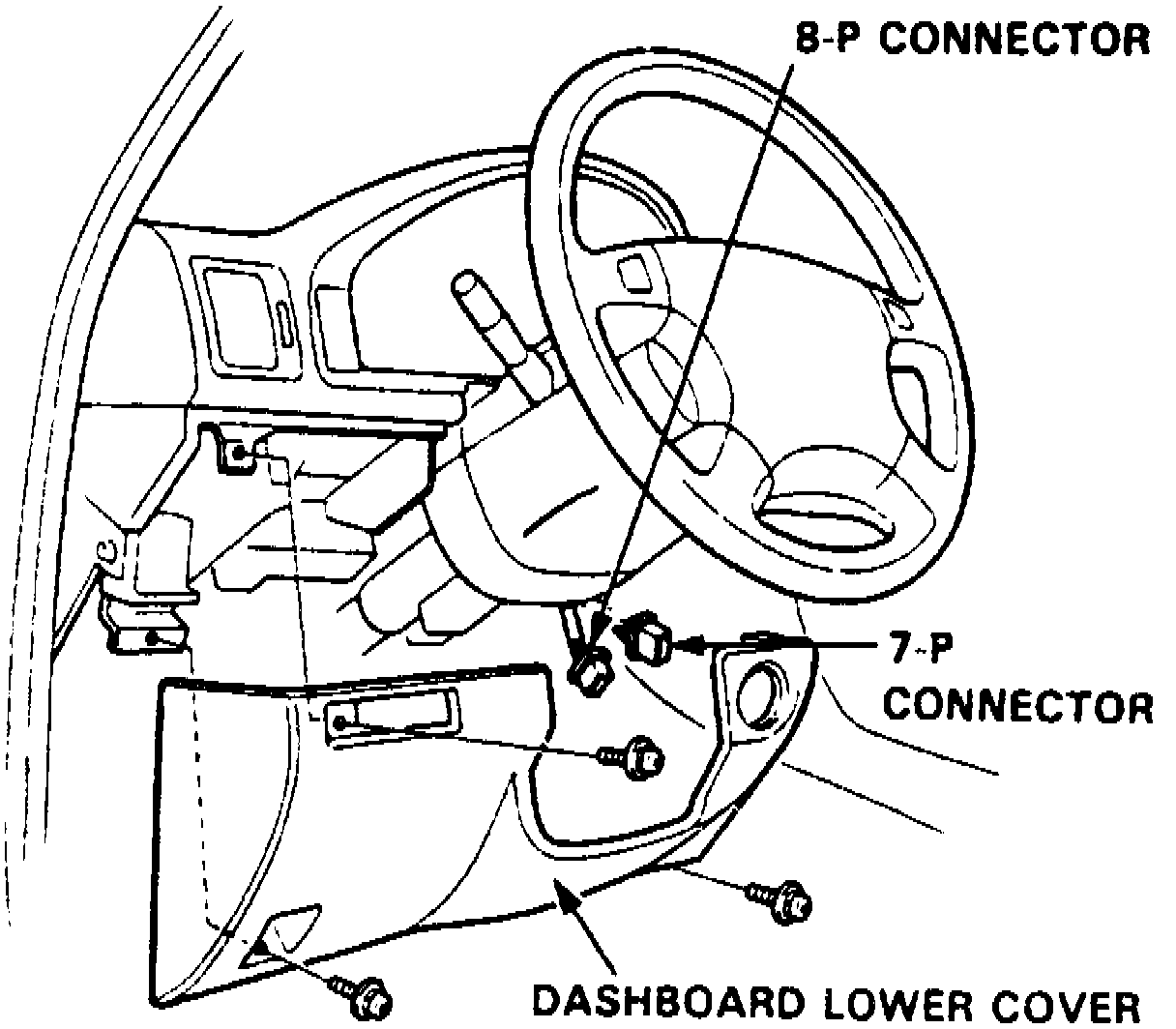 2. Remove instrument panel lower cover, then disconnect seven and eight pin connectors, Fig. 3.