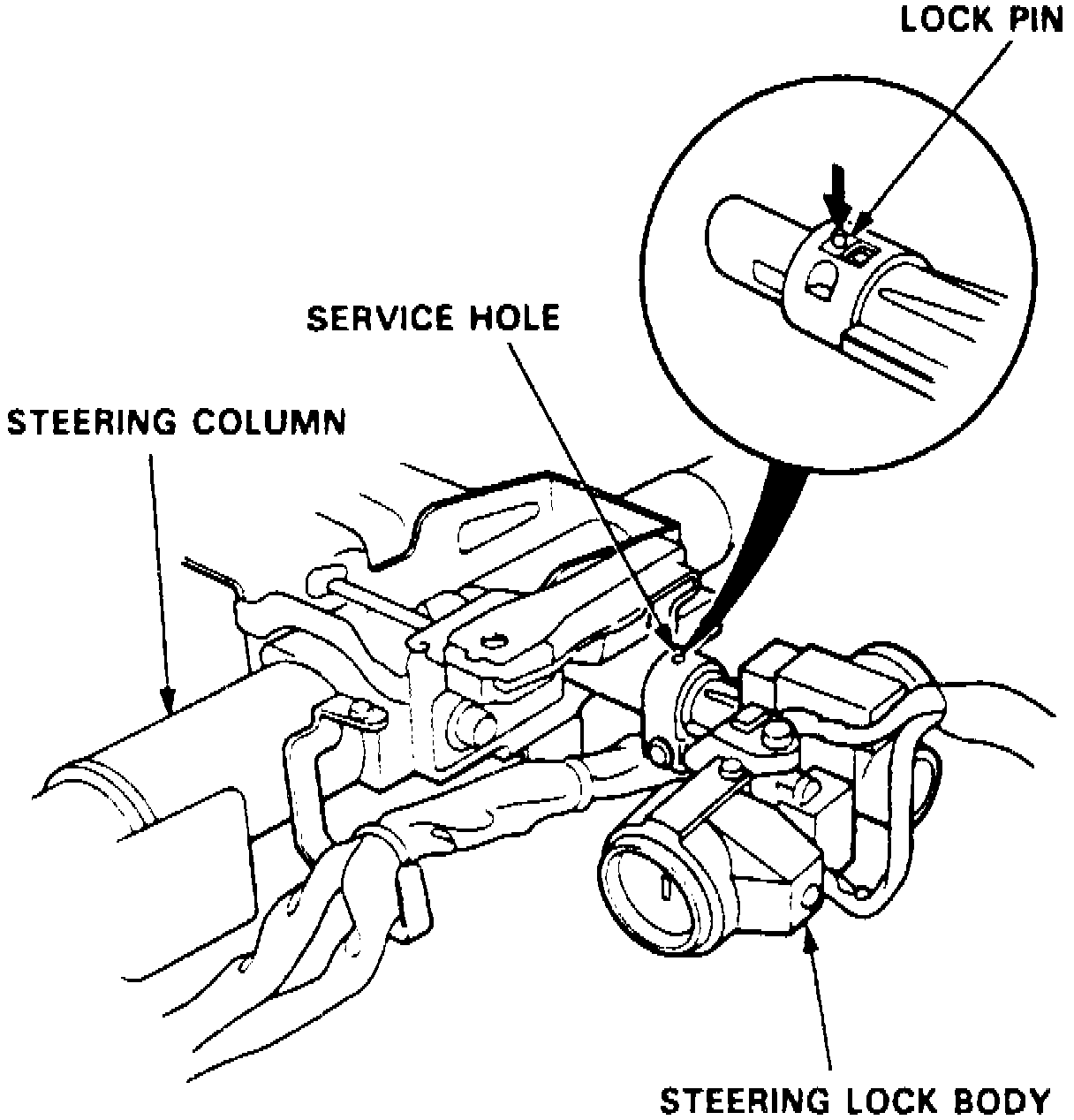 7. Insert ignition key and turn switch to I, then push down lock pin and remove steering lock body,
