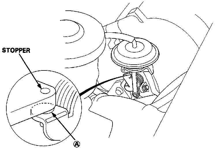 3. With the engine at idle, check that A of the IAB control valve is in close contact with the stopper when vacuum hose is disconnected.