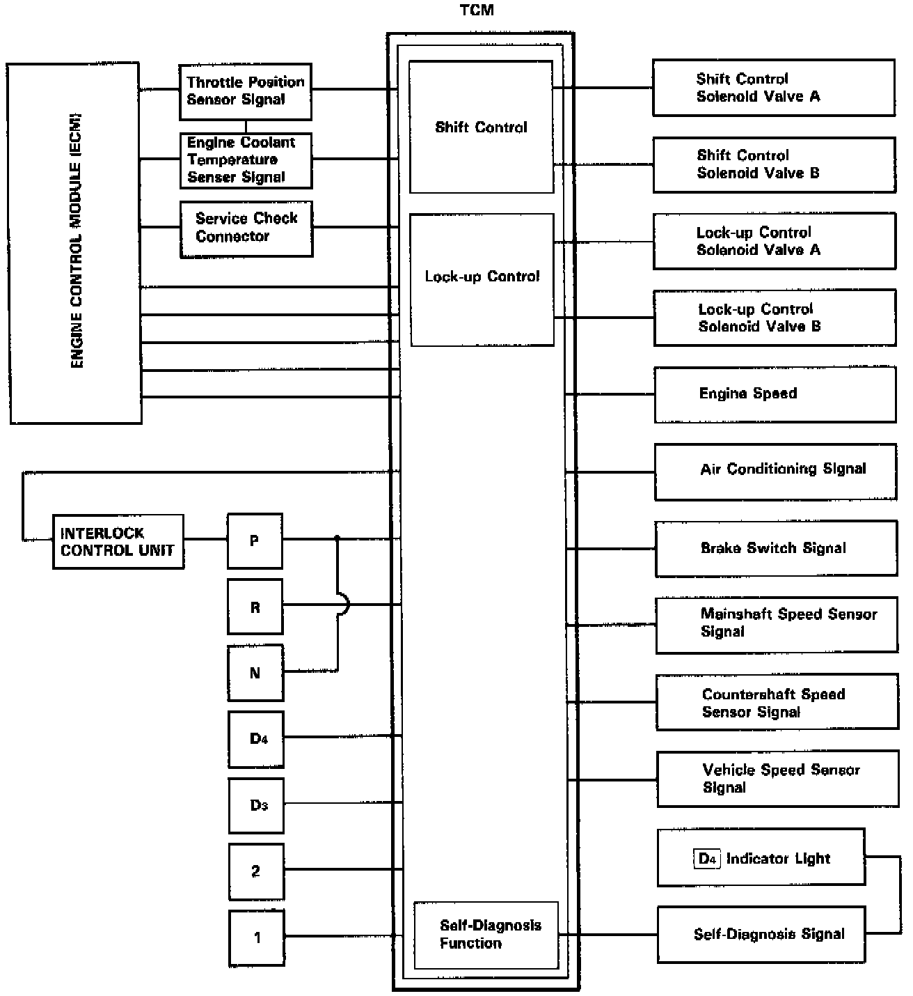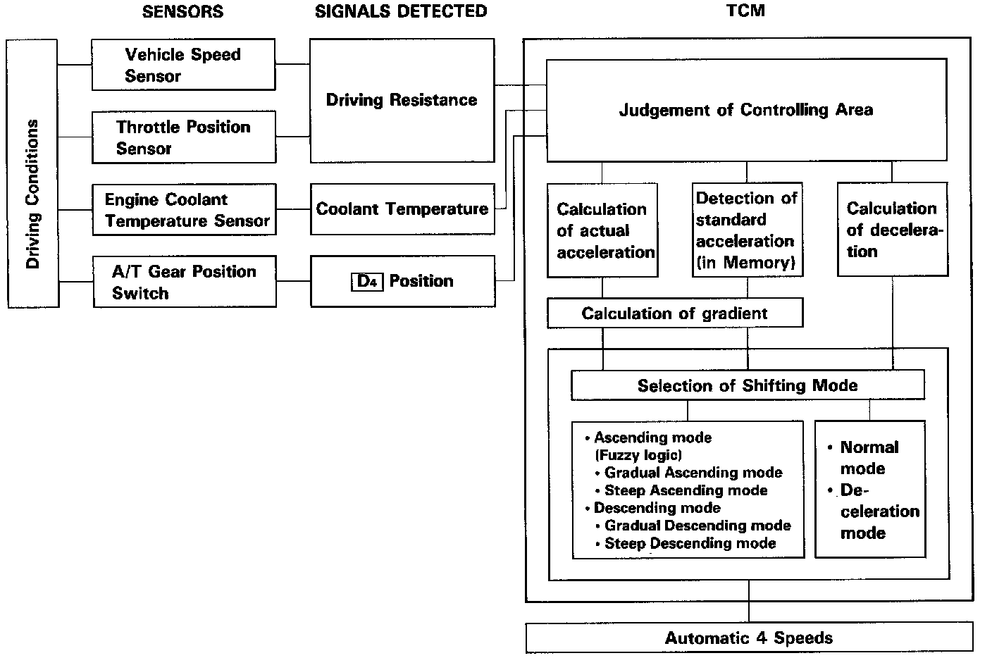 The TCM compares actual driving conditions with driving conditions memorized in the TCM, based on the input from the vehicle speed sensor, throttle position sensor, engine coolant temperature sensor, barometric pressure sensor, brake switch signal and shift lever position signal, to control shifting while a vehicle is ascending or descending a slope, or reducing speed.