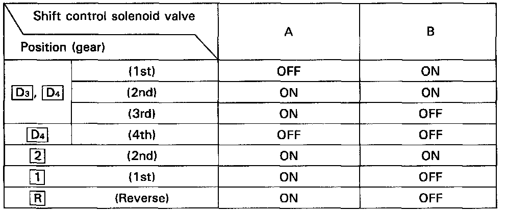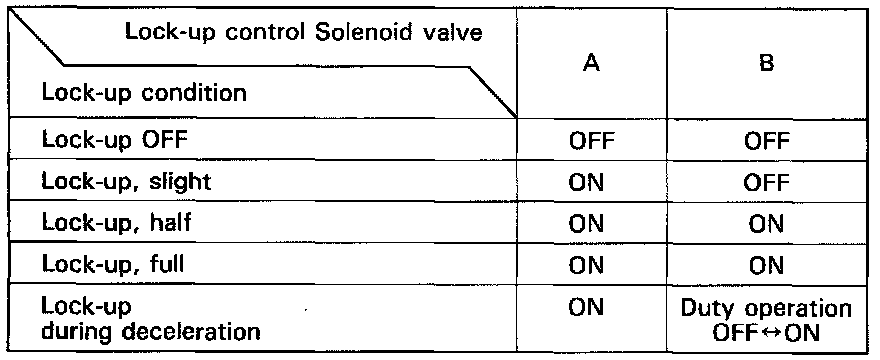 From sensor input signals, the TCM determines whether to turn the lock-up ON or OFF and activates lock-up control solenoid valve A and/or B accordingly. The combination of driving signals to lock-up control solenoid valves A and B is shown in the table below.
