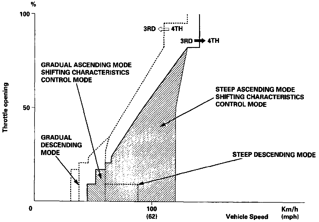 When the TCM determines that the vehicle is going down a hill in (D4) position, the shift-up speed from 3rd to 4th gear when the throttle is closed becomes faster than the set speed for flat road driving to widen the 3rd gear driving area. This, in combination with engine braking from the deceleration lock-up, achieves smooth driving when the vehicle is descending.