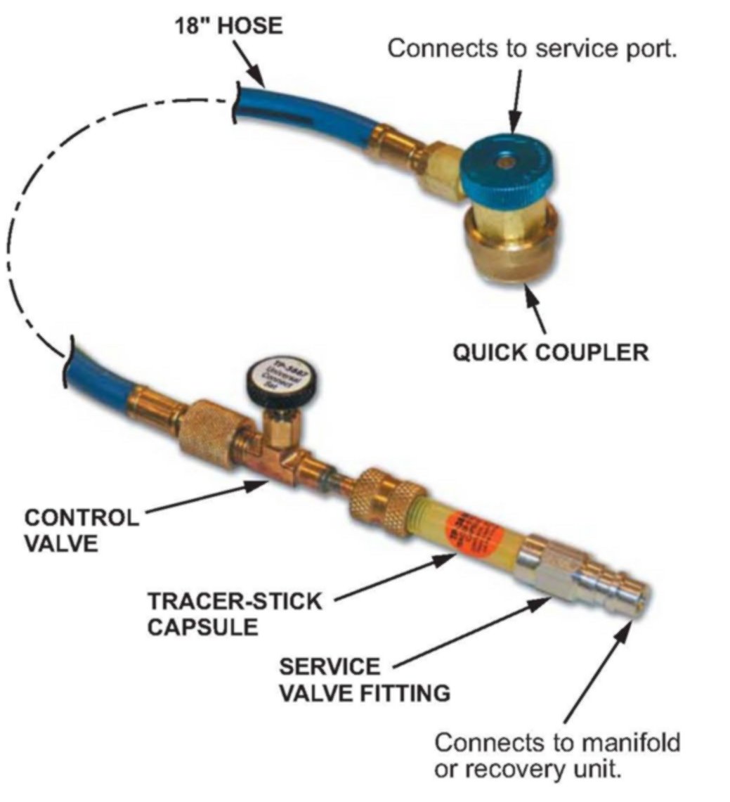 * ^ If you have recovered refrigerant to weigh it as part of your diagnostics, or if there is a low charge, it is more efficient to recharge the system using normal procedures before installing the universal connect set. Dye can then be added using approximately 0.05 lb (0.02 kg) of refrigerant.*