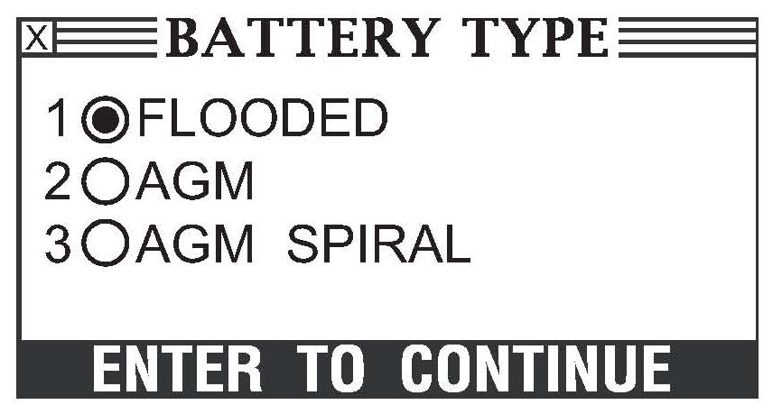 9. Use the arrow or number keys to select the battery CCA value, then press Enter. You can find the CCA on the battery label on the top of the battery. If the battery hold-down plate is covering the label, loosen the plate and shift it out of the way to read the CCA.