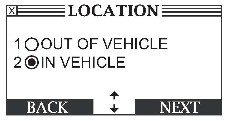 7. Use the arrow or number keys to select the location of the battery, either OUT OF VEHICLE or IN VEHICLE, then press Enter.