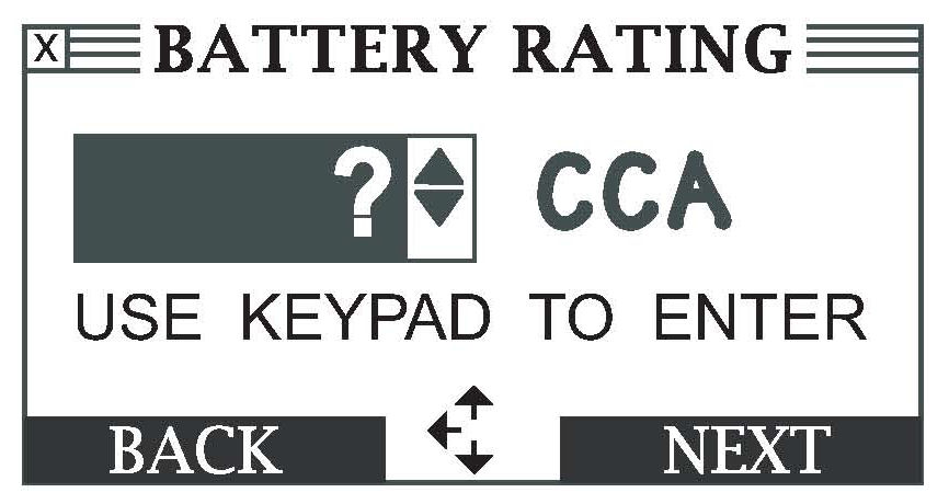 10. Use the arrow or number keys to select the battery CCA value, then press Enter. You can find the CCA on the battery label on the top of the battery. If the battery hold-down plate is covering the label, loosen the plate and shift it out of the way to read the CCA.