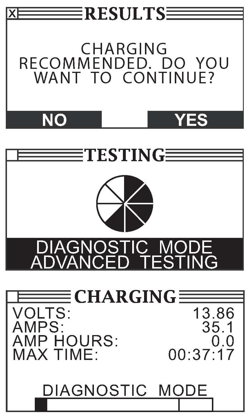12. If the battery voltage is below 60% of its state of charge (SOC), or the condition of the battery is unknown, the GR8 automatically changes to its diagnostic feature. A screen stating CHARGING RECOMMENDED. DO YOU WANT TO CONTINUE?" appears. Select Yes. After the battery is charged and diagnosed, go to step 13.