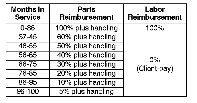 Enter and submit a parts warranty claim with the information listed and the full dealer net amount. The parts and labor reimbursement is calculated according to the schedule below after the warranty claim is submitted.