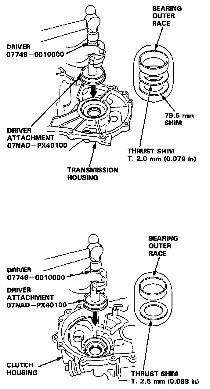 3. Install the thrust shim and 79.5 mm shim, then drive the bearing outer race in the transmission housing.