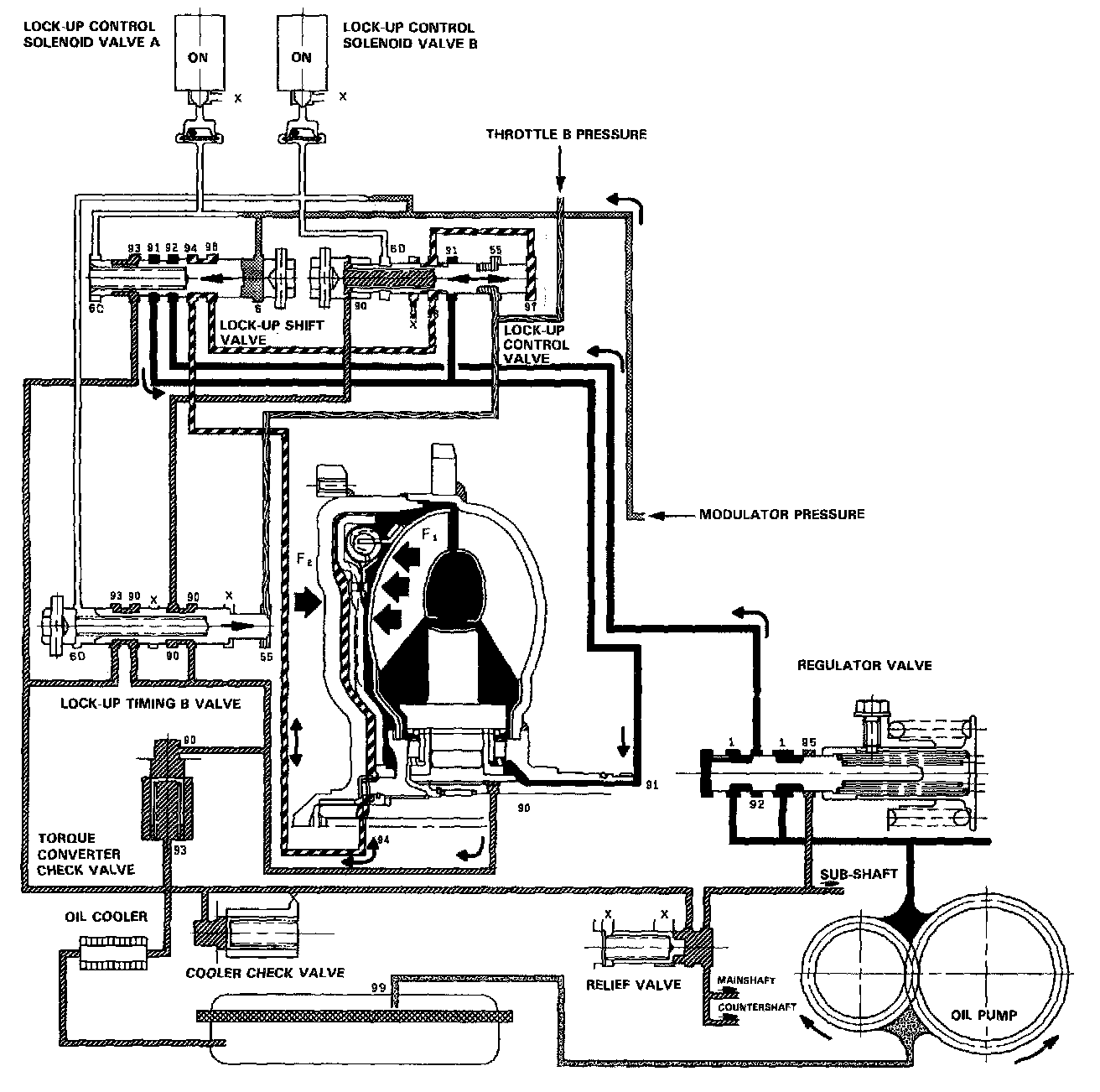 Also the modulator pressure in the left cavity of the lock-up timing B valve is low. However the throttle B pressure is still low at this time; consequently. the lock-up timing B valve is kept on the right side by the spring force. With the lock-up control solenoid valve B turned on, the lock-up control valve is moved somewhat to the left side, causing the back pressure (F2) to lower. This allows a greater amount of the fluid (F1) to work on the lock-up clutch so as to engage the clutch. The back pressure (F2) which still exists prevents the clutch from engaging fully.