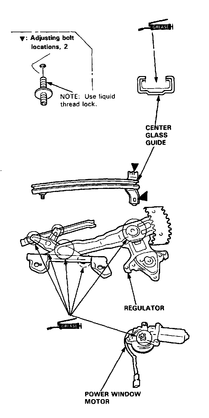 9. Grease all the sliding surfaces of the regulator and center glass guide where shown.