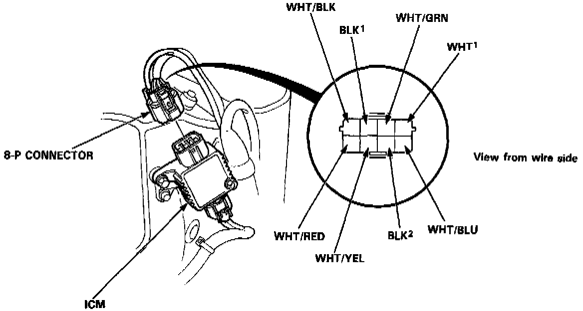 Disconnect the 8-P connector from the ignition control module (ICM). Inspect the connector and socket terminals to be sure they are all making good contact.