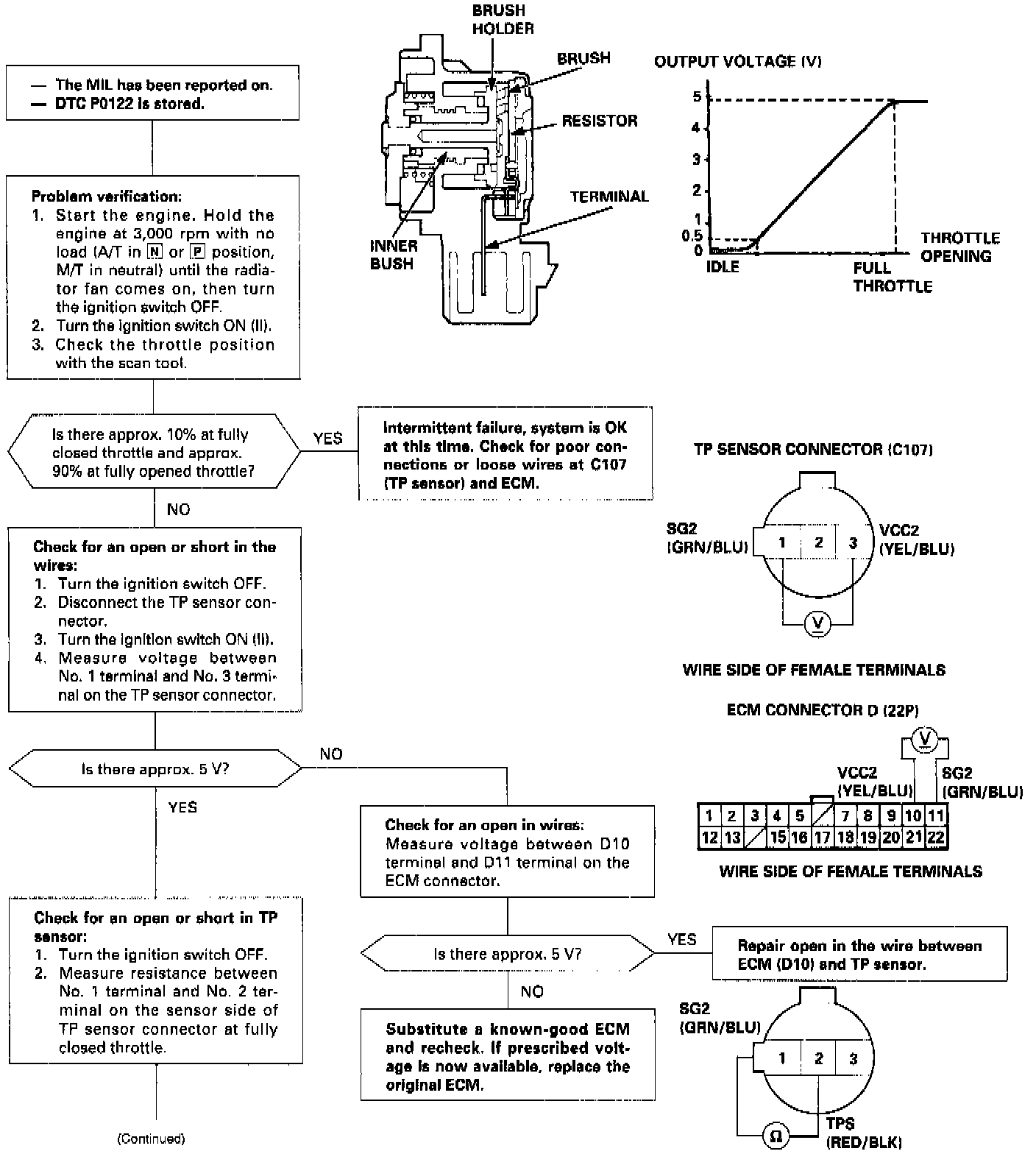 - The scan tool indicates Diagnostic Trouble Code (DTC) P0122: A low voltage problem in the Throttle Position P0122 (TP) sensor circuit.