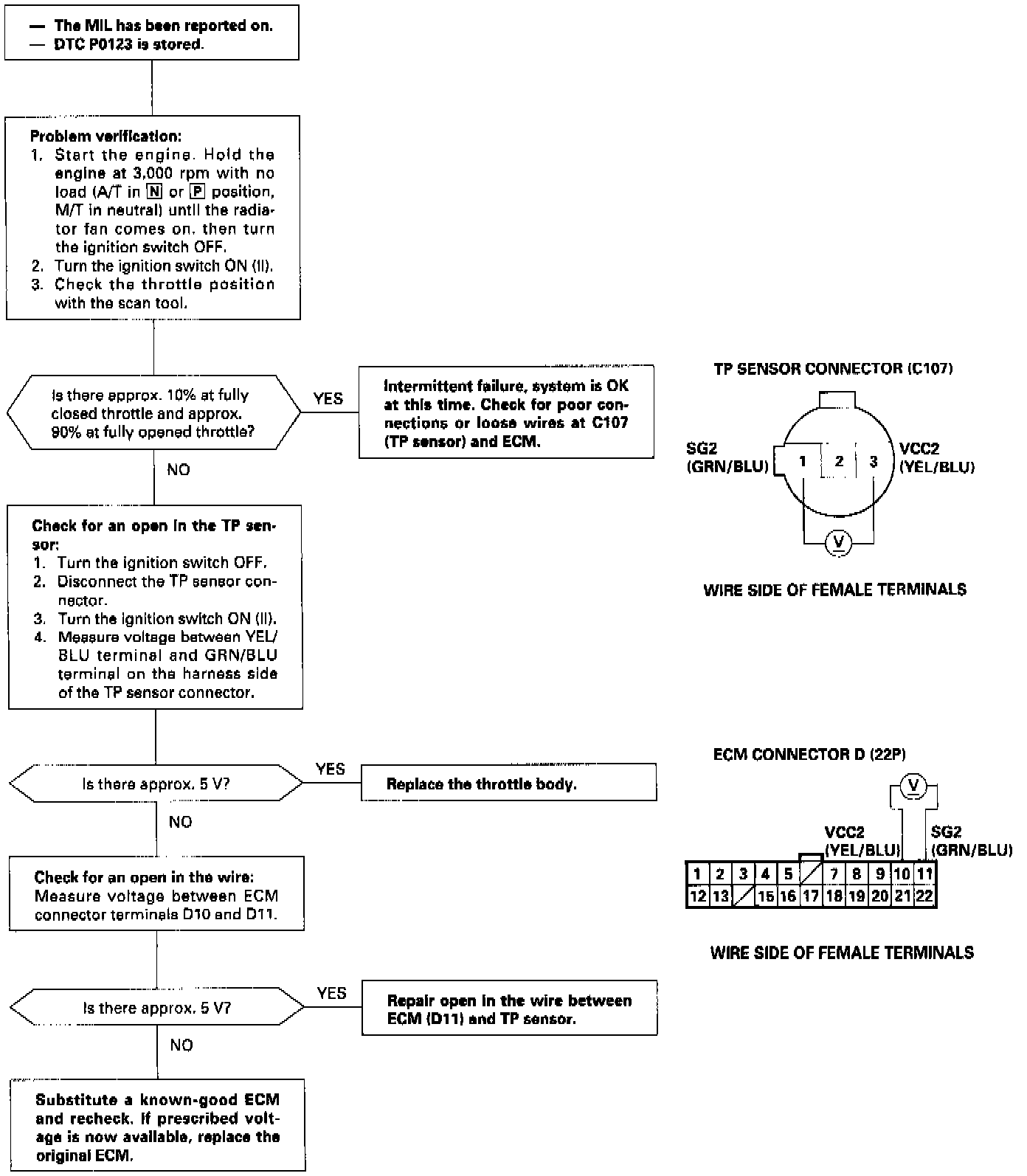 - The scan tool indicates Diagnostic Trouble Code (DTC) P0123: A high voltage problem in the Throttle Position P0123 (TP) sensor circuit.