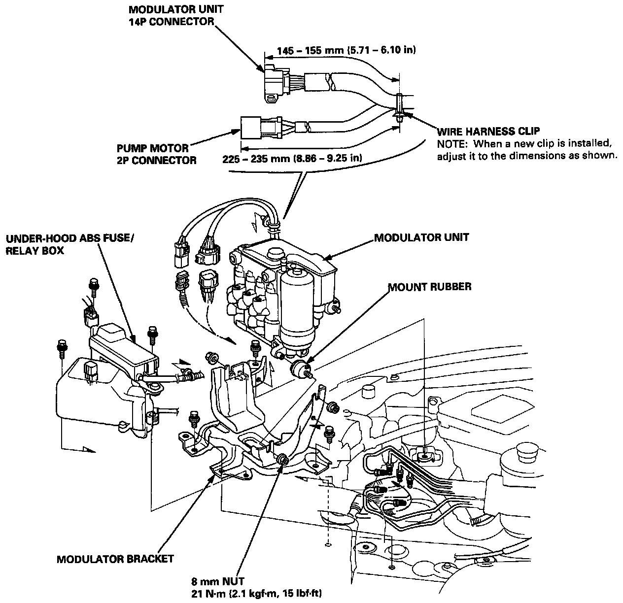 NOTE: When a new harness clip is installed after a wire harness or modulator unit replacement, adjust the harness clip to the dimensions shown in image.