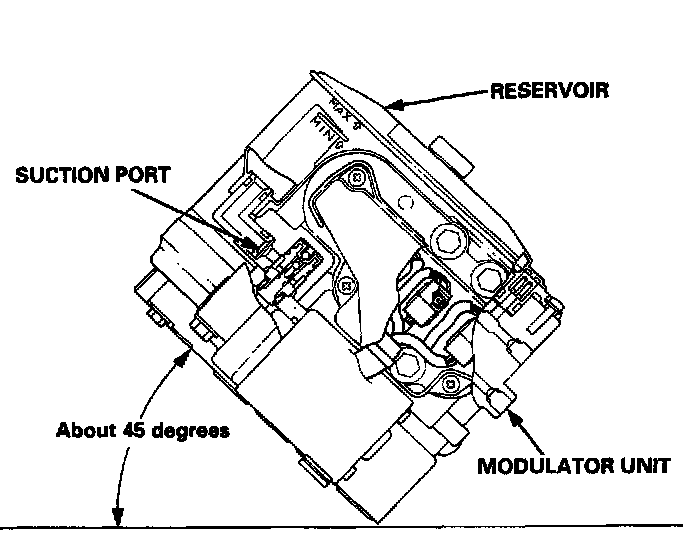 2. Before installing the modulator unit on the car, be sure to bleed the air from the suction port in the modulator unit by leaning the modulator unit to one side slowly (about 45 degrees) as shown.