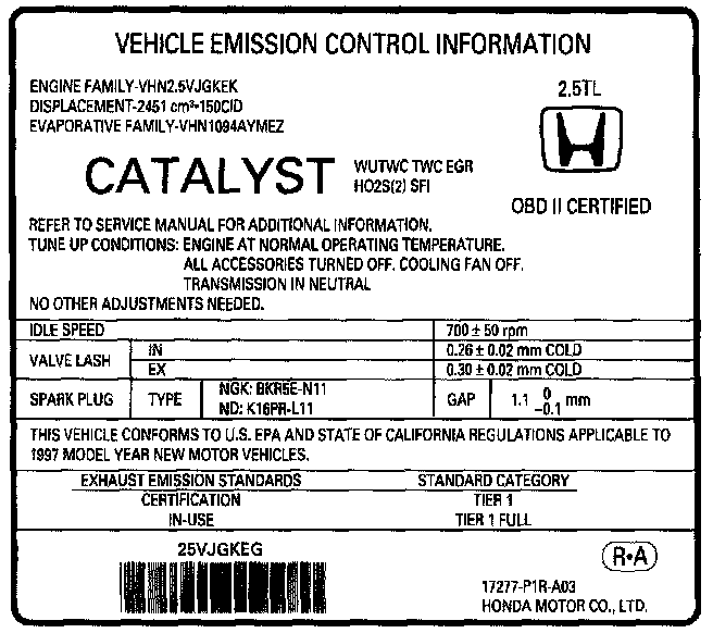 THIS VEHICLE CONFORMS TO U.S. EPA AND STATE OF CALIFORNIA REGULATIONS APPLICABLE TO 1997 MODEL YEAR NEW MOTOR VEHICLES.