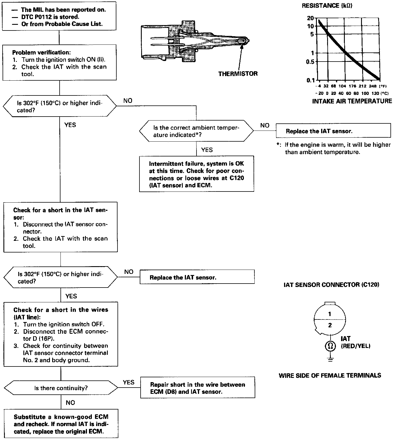 The scan tool indicates Diagnostic Trouble Code (DTC) P0112: A low voltage (high temperature) problem in the Intake Air Temperature (IAT) sensor circuit.