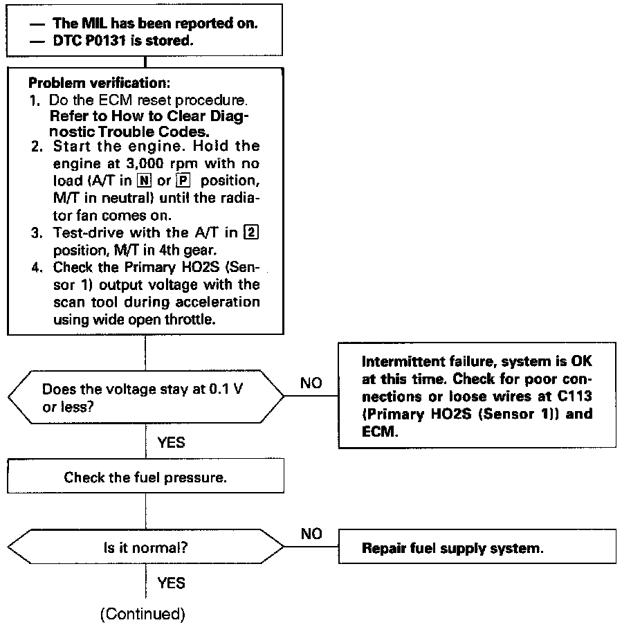 The scan tool indicates Diagnostic Trouble Code (DTC) P0131: A low voltage problem in the Primary Heated Oxygen Sensor (HO2S) (Sensor 1) circuit.