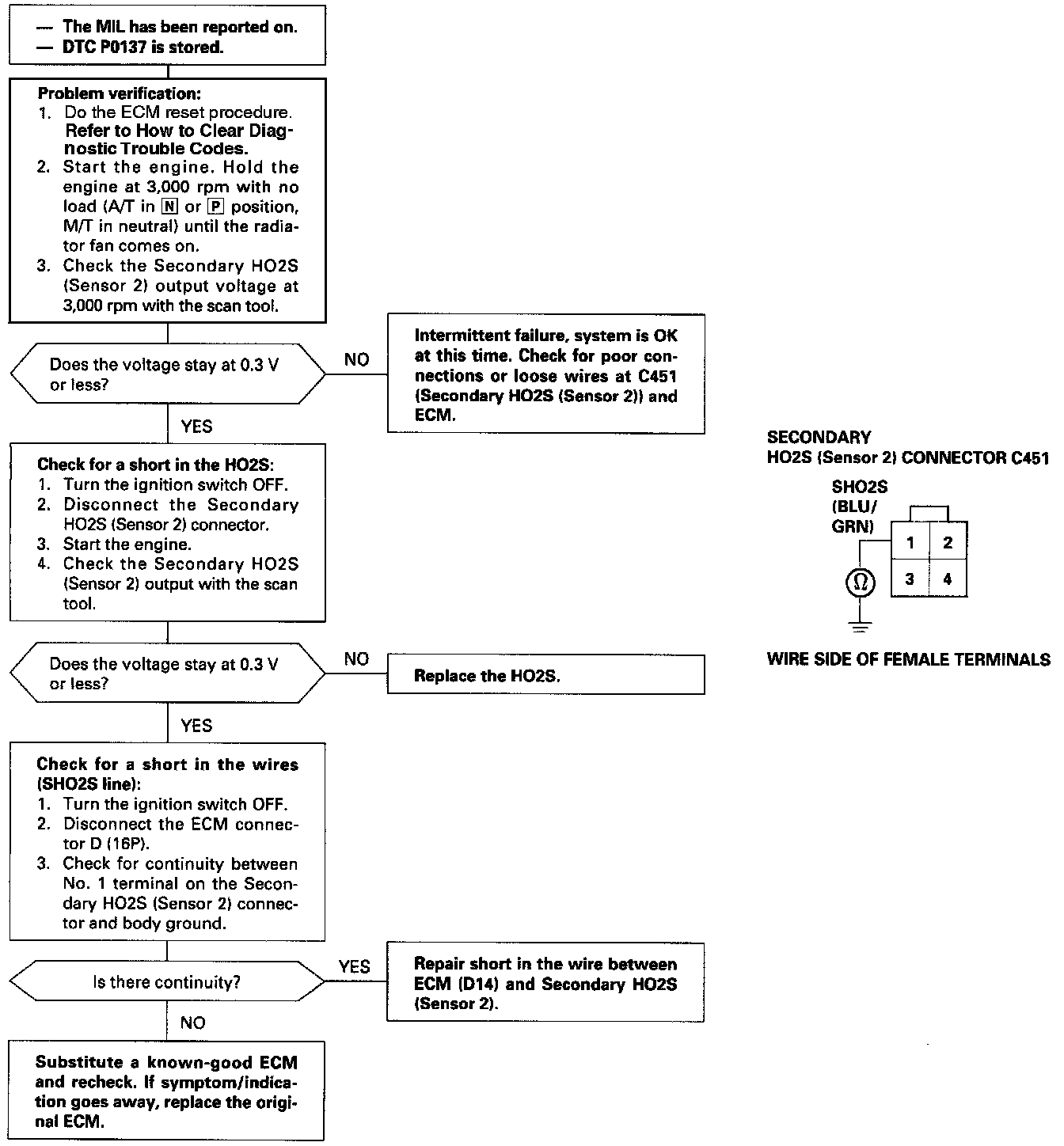 The scan tool indicates Diagnostic Trouble Code (DTC) P0137: A low voltage problem in the Secondary Heated Oxygen Sensor (HO2S) (Sensor 2) circuit.
