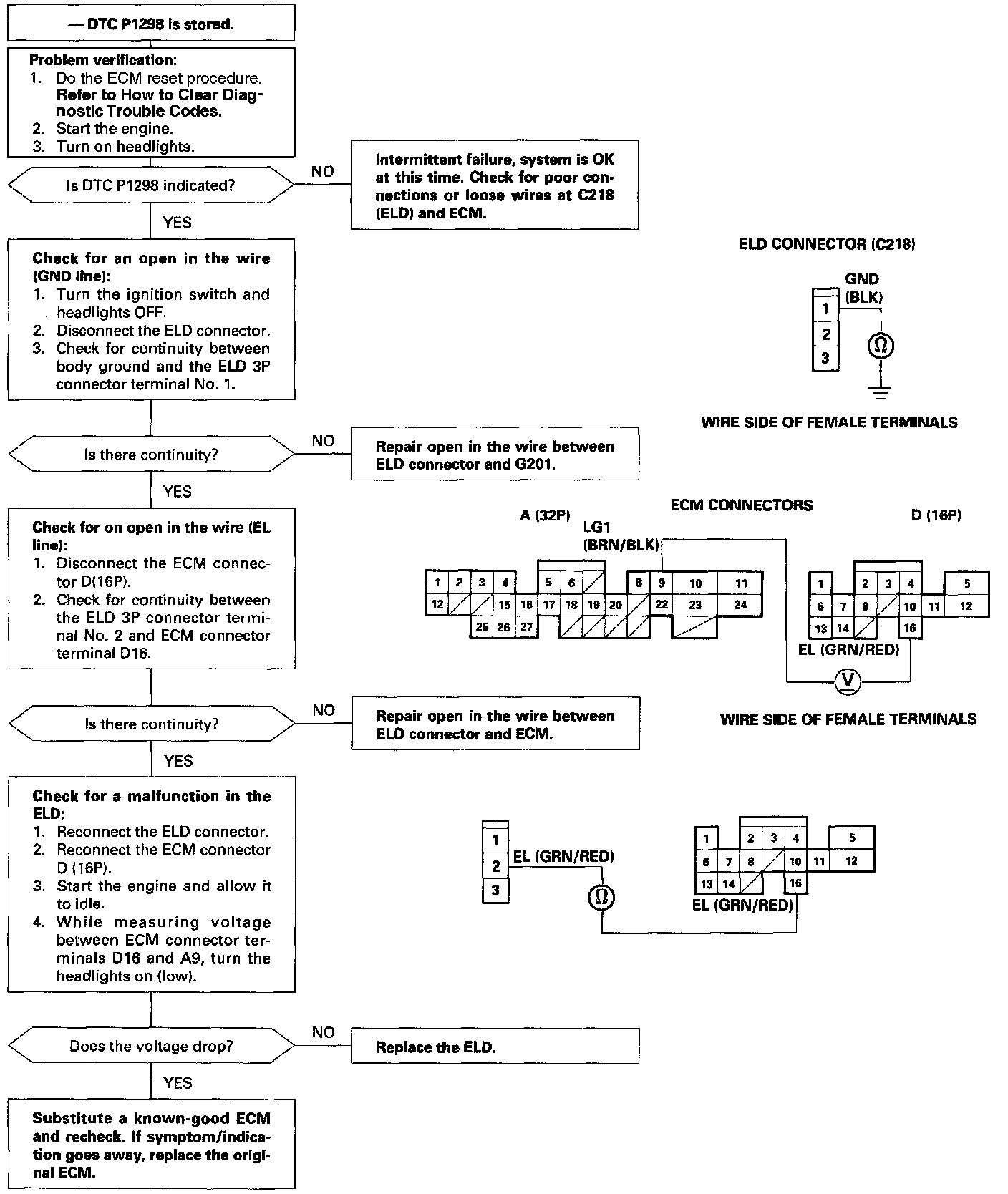 The scan tool indicates Diagnostic Trouble Code (DTC) P1298: A high voltage problem in the Electrical Load Detector (ELD) circuit.