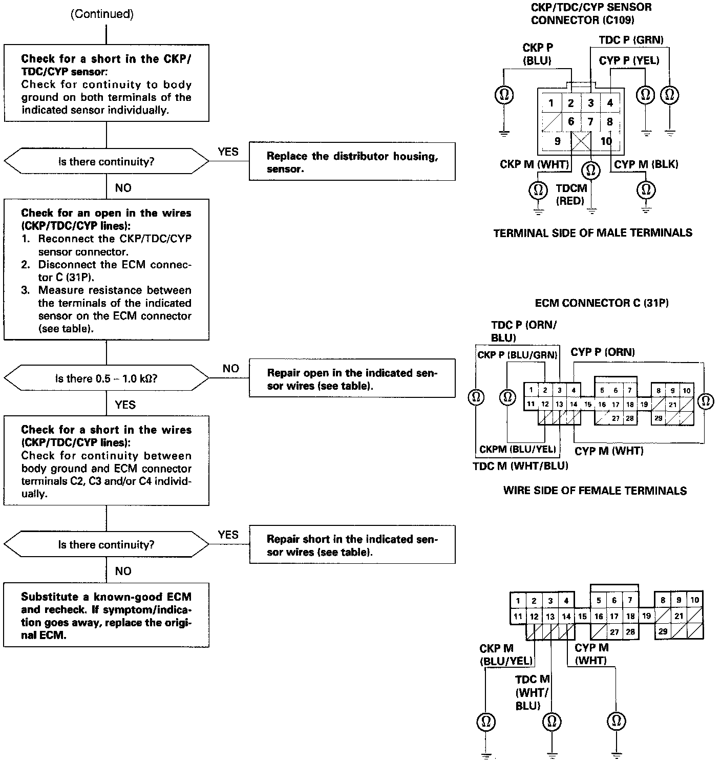 The CKP Sensor determines timing for fuel injection and ignition of each cylinder and also detects engine speed. The TDC Sensor determines ignition timing at start-up (cranking) and when crank angle is abnormal. The CYP Sensor detects the position of No. 1 cylinder for sequential fuel injection to each cylinder.
