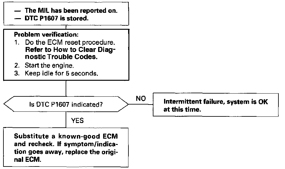 The scan tool indicates Diagnostic Trouble Code (DTC) P1607: An ECM Internal Circuit Failure A.