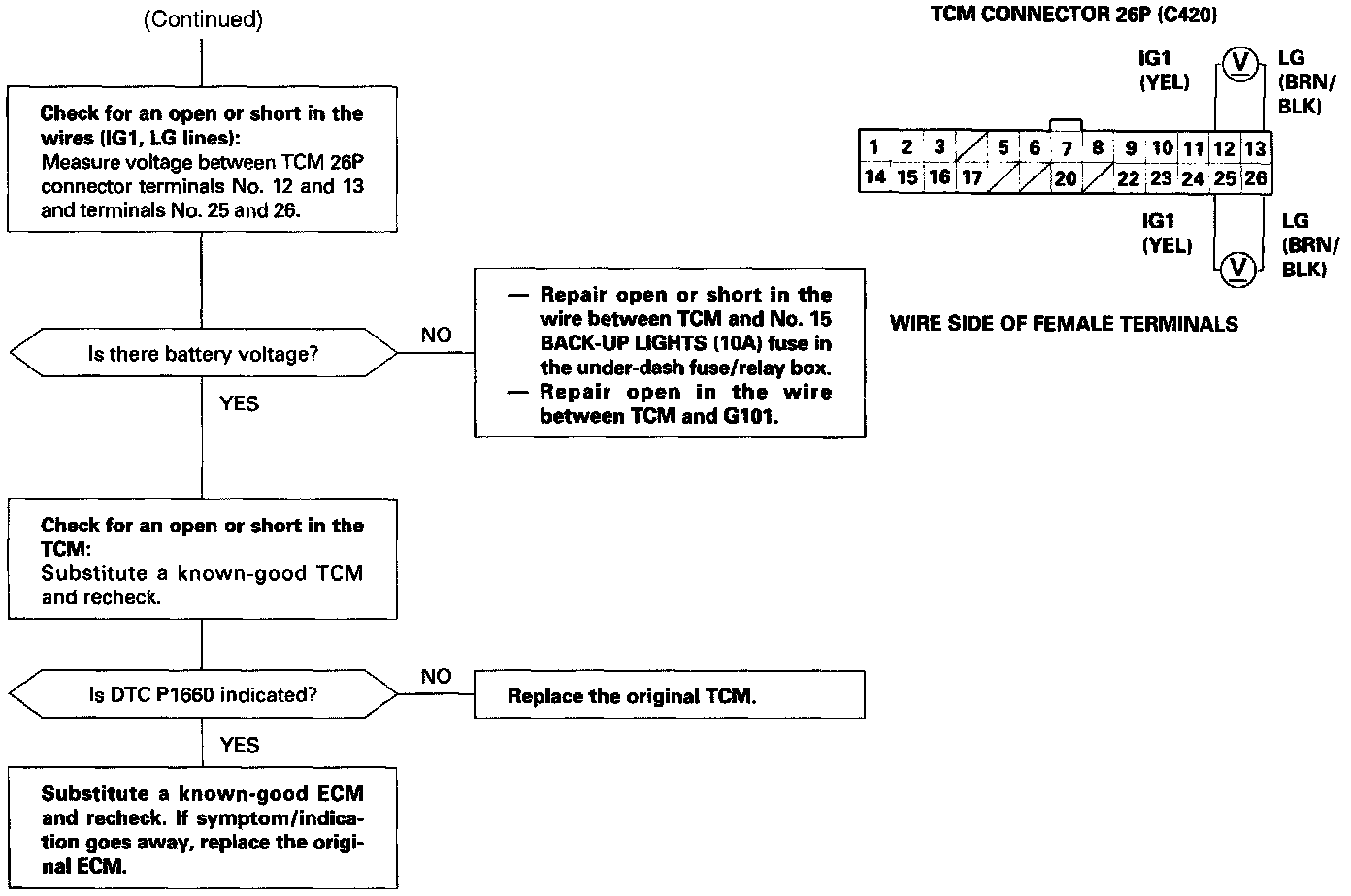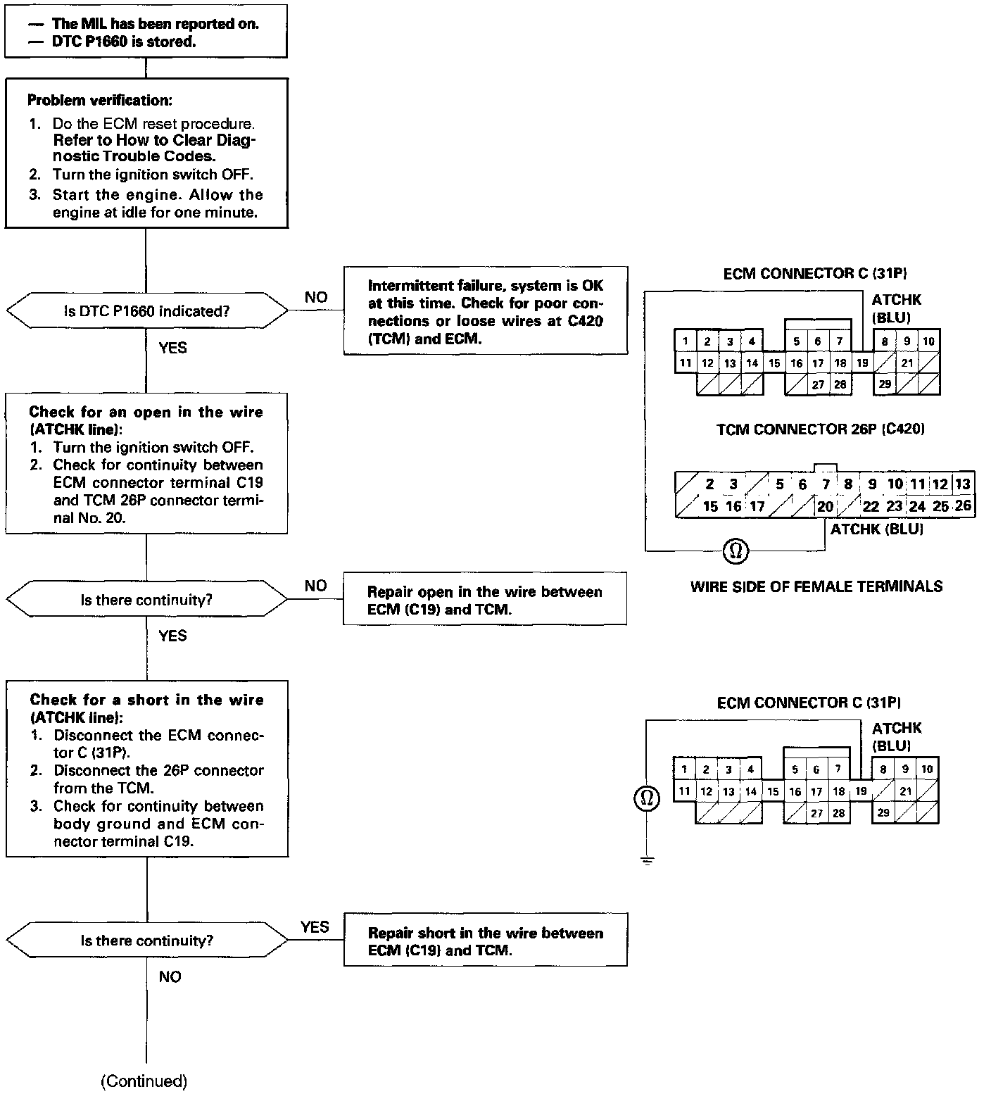 The scan tool indicates Diagnostic Trouble Code (DTC) P1660: A problem in the A/T FI data line.