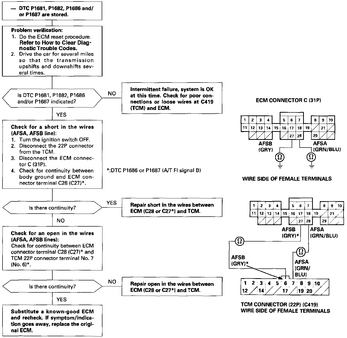 The scan tool indicates Diagnostic Trouble Code (DTC) P1686: A low voltage problem in the A/T FI signal B circuit.