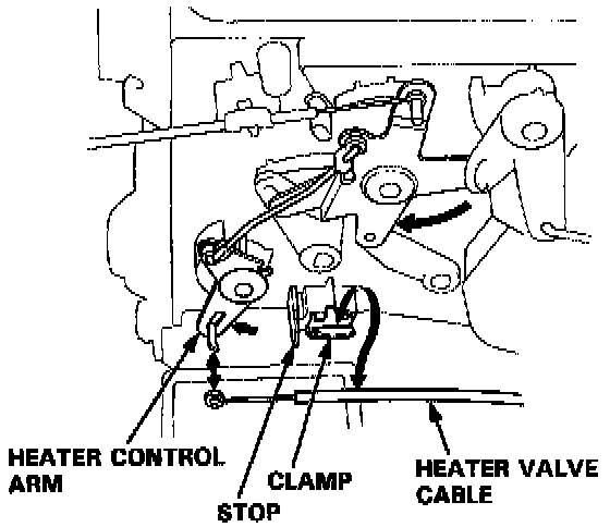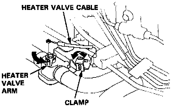 Heater Valve Cable1. Disconnect the heater valve cable from the heater valve arm and the clamp, and from the heater control arm and the clamp.