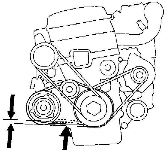 1. Apply a force of 98 N (10 kgf, 22 lbf), and measure the deflection between the A/C compressor and the crankshaft pulley.