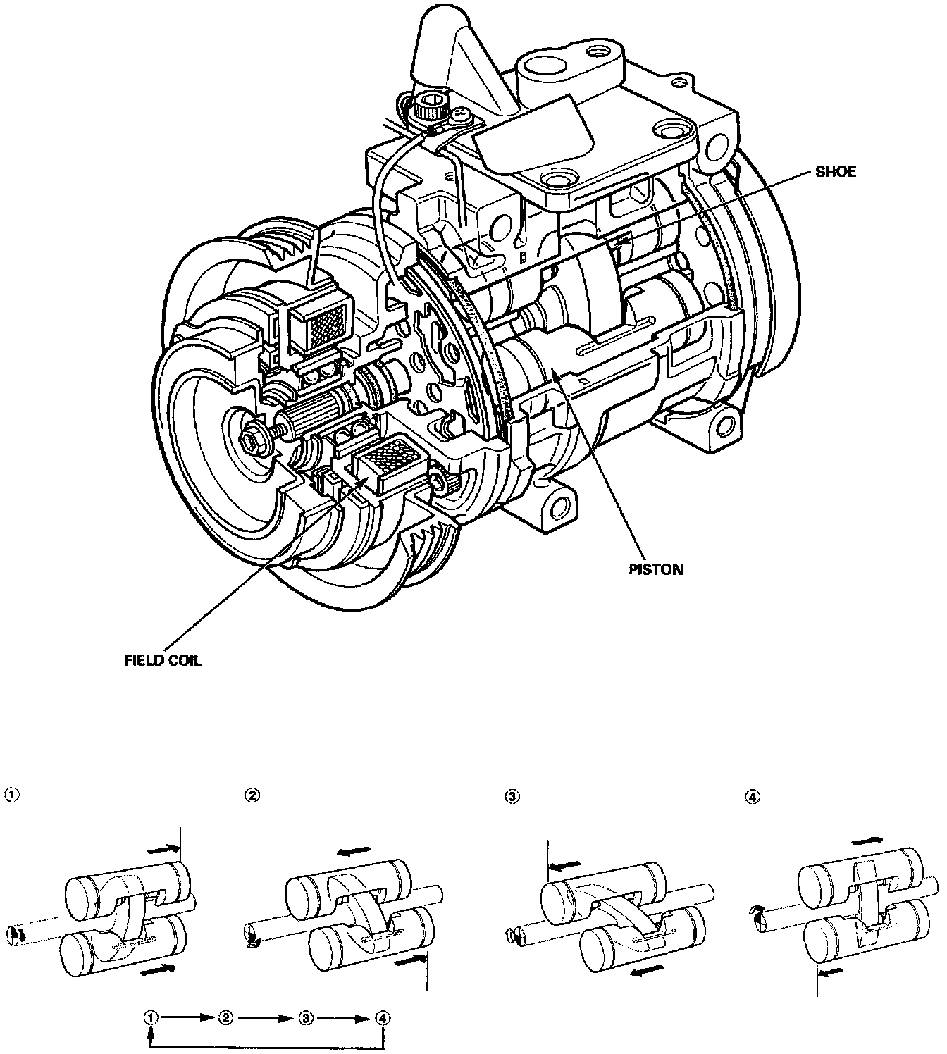 As the inclined disc revolves, it pushes the pistons, protected by a ceramic shoe, thus compressing the refrigerant.