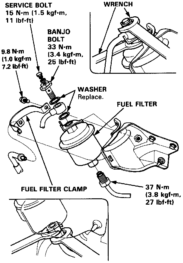 The fuel filter should be replaced whenever the fuel pressure drops below the specified value (275 - 324 kPa, 2.8 - 3.3 kgf/cm2, 40 - 47 psi with the fuel pressure regulator vacuum hose disconnected) after making sure that the fuel pump and the fuel pressure regulator are OK.