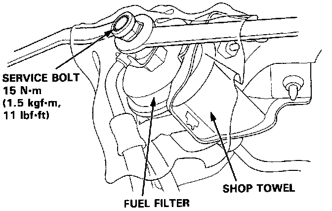 - Before disconnecting fuel pipes or hoses, release pressure from the system by loosening the 6 mm service bolt on top of the fuel filter.