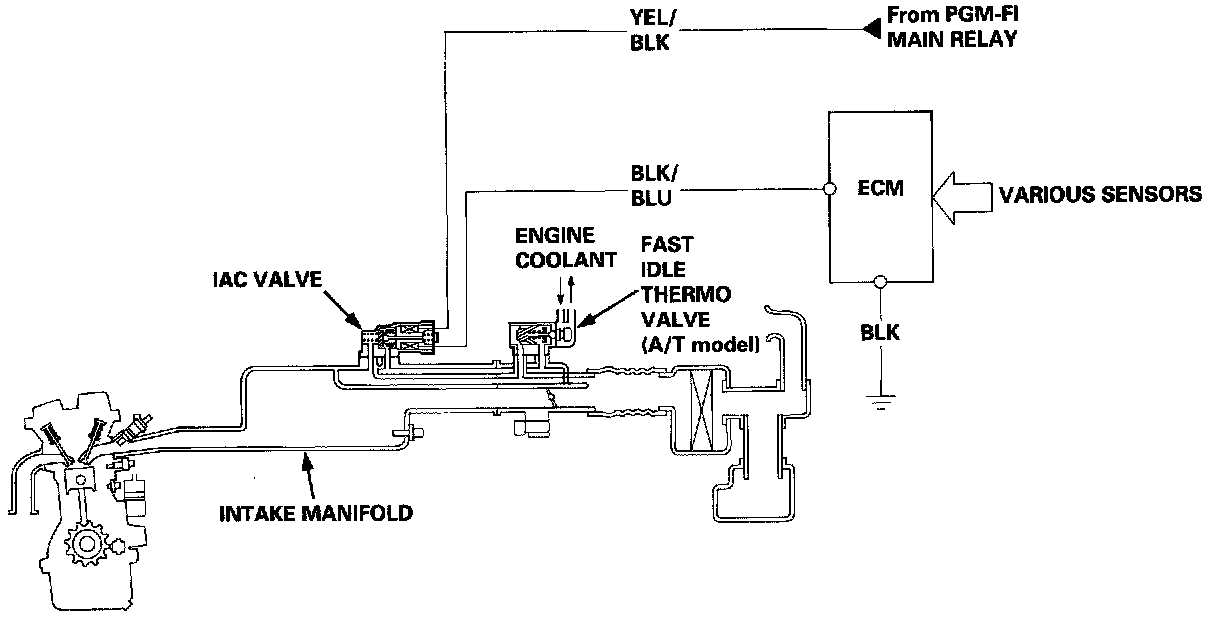 2. When the coolant temperature is low, the IAC valve is opened to obtain the proper fast idle speed. The amount of bypassed air is thus controlled in relation to the engine coolant temperature.