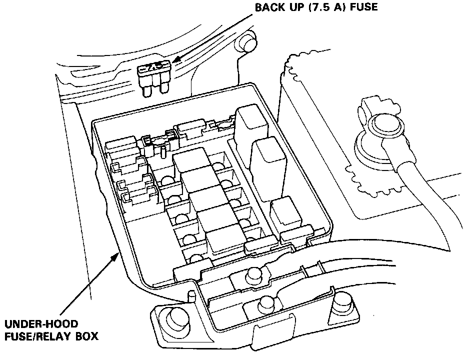 OFF. Remove the BACK UP (7.5 A) fuse from the under-hood fuse/relay box for 10 seconds.