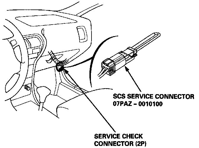 - Connect service connector special tool No. 07PAZ--0010100, or equivalent, to service check connector located under passenger's side of dash.
