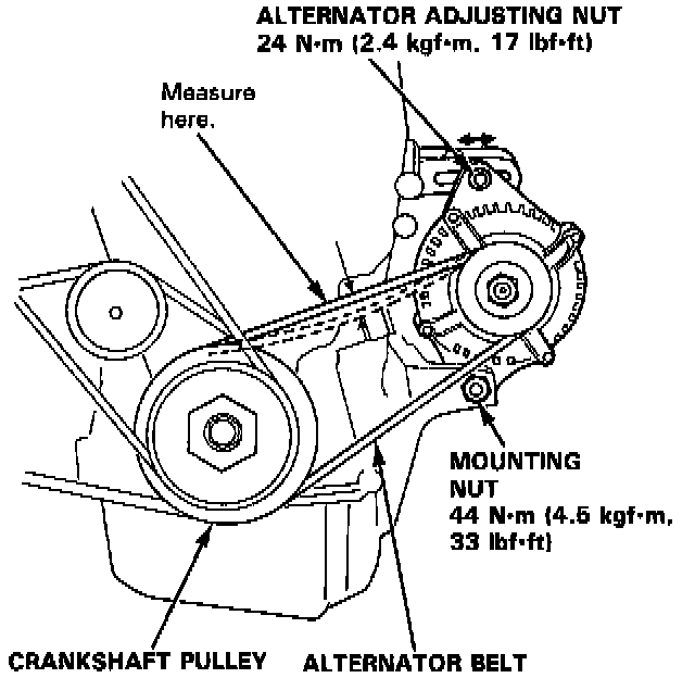 Apply a force of 98 N (10 kgf, 22 lbf) and measure the deflection between the alternator and the crankshaft pulley.