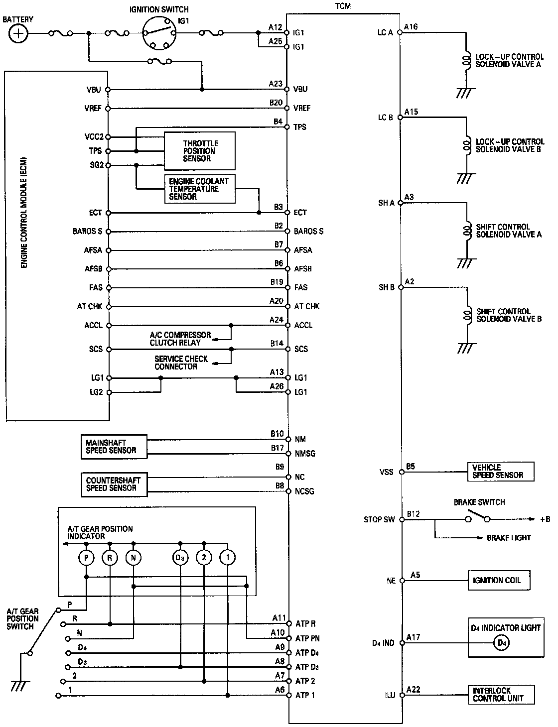 The TCM compares actual driving conditions with driving conditions memorized in the TCM, based on the input from the vehicle speed sensor, throttle position sensor, engine coolant temperature sensor, barometric pressure sensor, brake switch signal and shift lever position signal, to control shifting while a vehicle is ascending or descending a slope, or reducing speed.