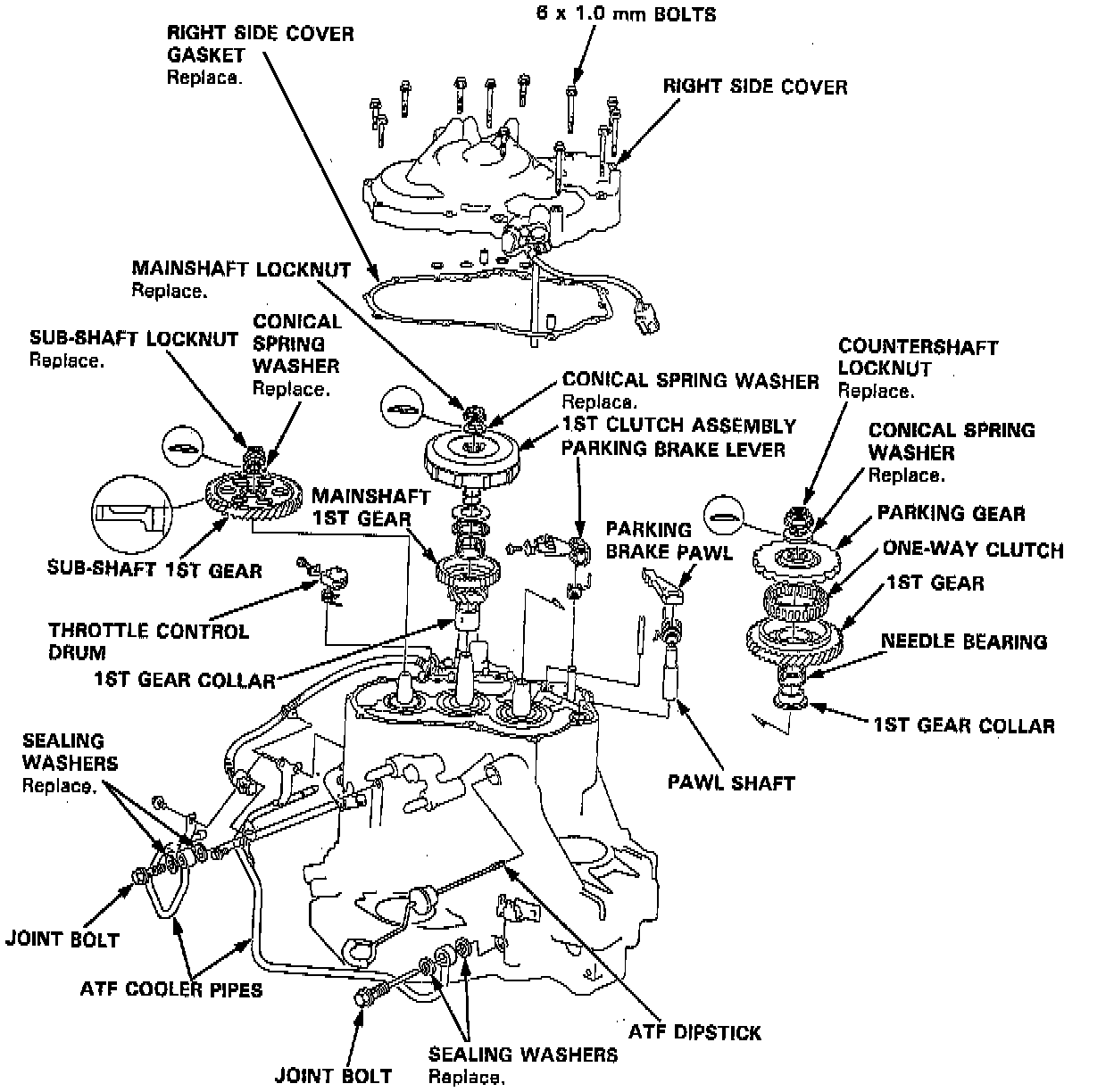 - When removing the transmission right side cover, replace the following: