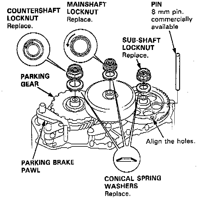 4. Align the hole of the sub-shaft 1st gear with the hole of the the transmission housing, then insert a pin to lock the sub-shaft while removing the sub-shaft locknut.